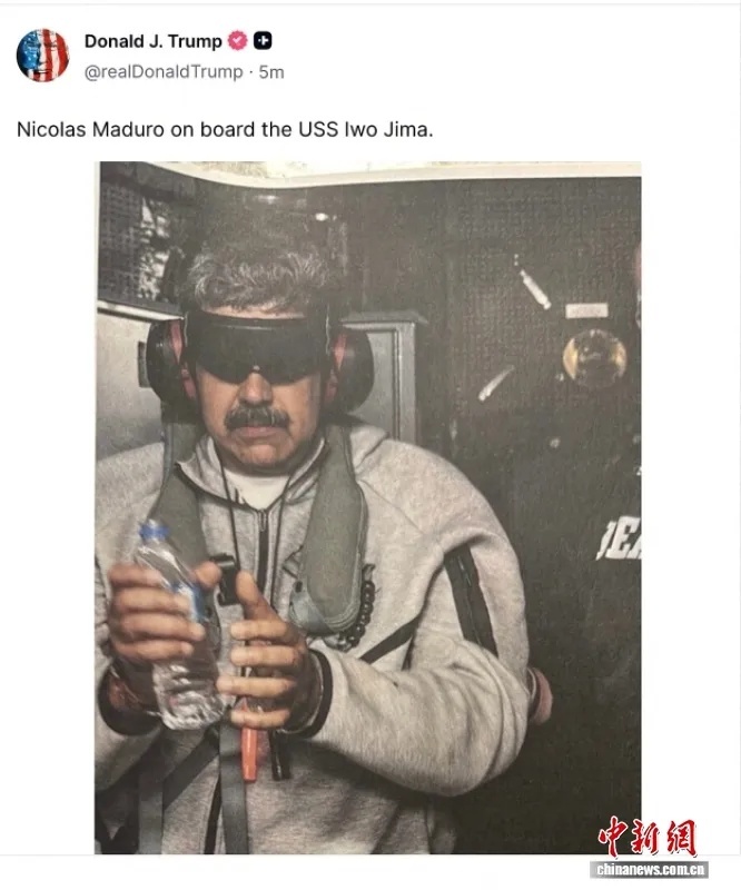 美国总统特朗普当地时间2026年1月3日在社交媒体平台上发布委内瑞拉总统马杜罗在美国军舰上戴手铐、双眼被黑布蒙住的照片,并配文“马杜罗在美国军舰上”。特朗普社交账号截图